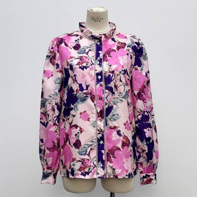 Vintage Floral Print Stand Collar Long Sleeve Shirt Elegant Ruffled Collar Loose Chiffon Top