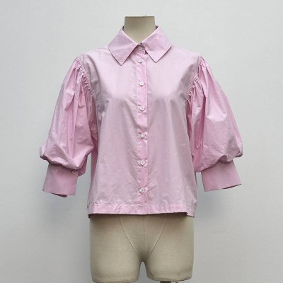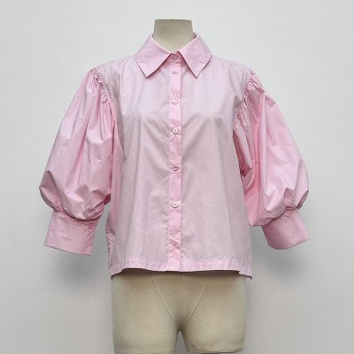 Pink Lapel Puff Sleeve Shirt Loose Short Quarter Sleeve Blouse