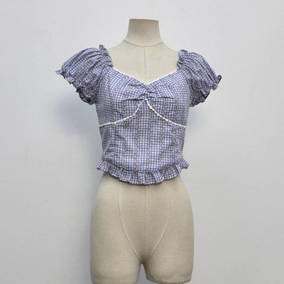 French Plaid Square Neck Puff Sleeve Cropped Top Lace Patchwork Waist Cinched Navel-Exposed Sweet Spicy Blouse