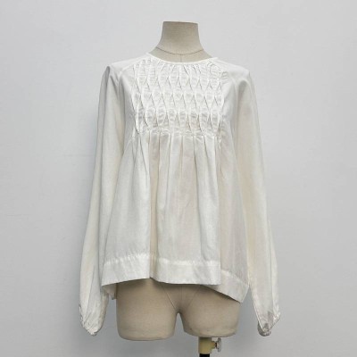 Pleated Design Round Neck Loose Long Sleeve White Blouse