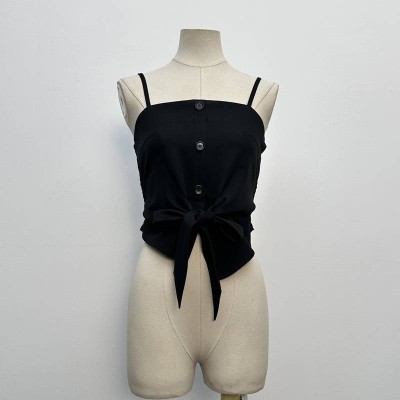 Black Short Tie-up Camisole Vest Simple Button Design Waist-exposed Top