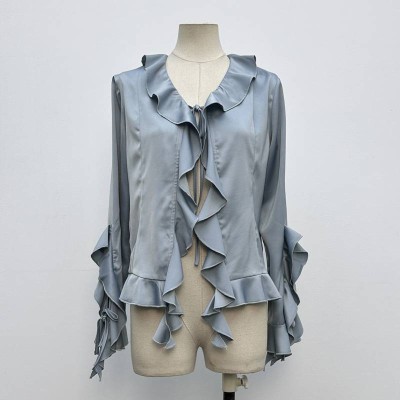 Gray-blue Satin Ruffled Tie-neck V-neck Long-sleeve Top Elegant Loose-fit Chiffon Blouse