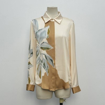 Elegant Printed Lapel Long Sleeve Shirt Commuter Satin Blouse