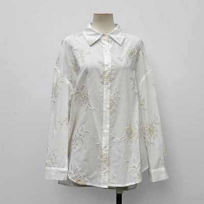 Vintage White Embroidered Long Sleeve Shirt Loose Lapel Hollow Out Embroidered Blouse