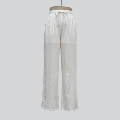 White Drawstring Loose Wide-Leg Lace Trim Casual Loungewear Pants