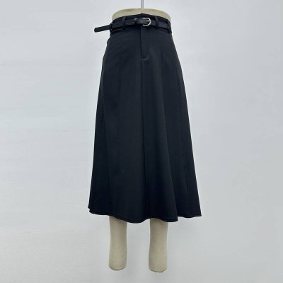 Simple Temperament Black High-waisted Midi Skirt With Belt Commuter A-line Skirt