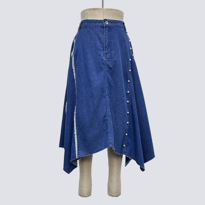 Pearl Decor Raw Edge Asymmetrical Hem Denim Midi Skirt