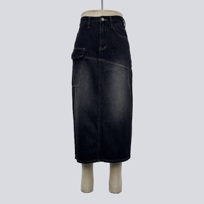 Black Gray Washed Cargo Style Denim Midi Skirt