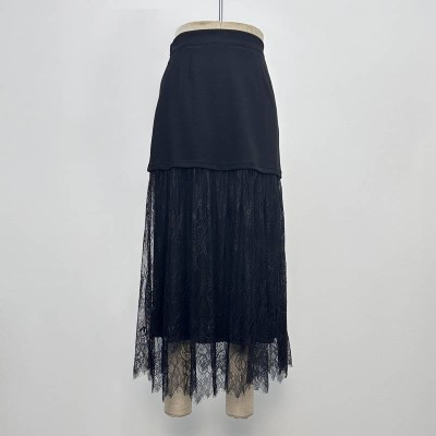 Black Spliced Lace Midi Skirt Elegant Slim Mesh Skirt