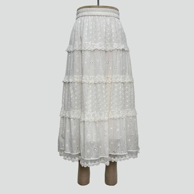 French White Hollow Embroidered Tiered Skirt Elastic High Waist Slimming Midi Skirt
