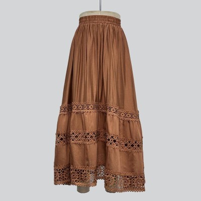 Brown Hollow Embroidery Elastic Waist Maxi Skirt