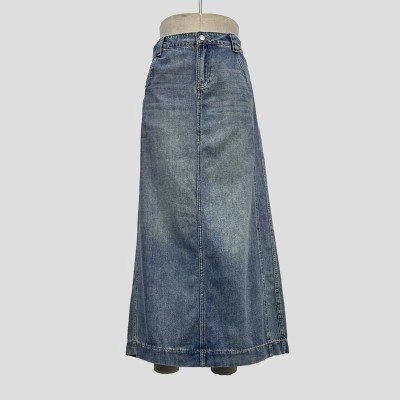 Vintage Washed Denim Maxi Skirt High Waist Slim Fit Mid-length Denim Skirt