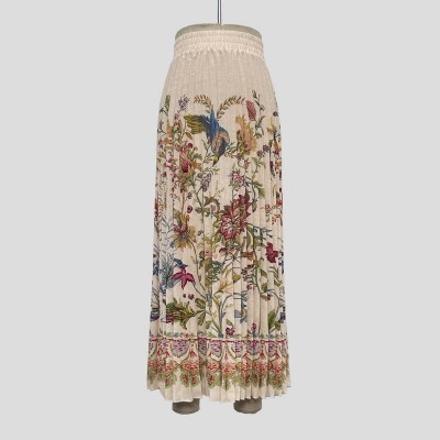 Vintage Floral Bird Print Pleated High Waist Maxi Skirt