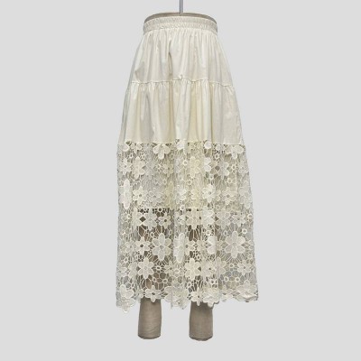 French Lace Patchwork Solid Color Maxi Skirt Elegant Hollow Out Temperament Skirt