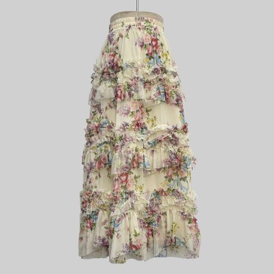 French Floral Ruffled Tiered Maxi Skirt Gentle Style High Waist Slim Chiffon Cake Skirt