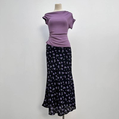 Charming Purple Waist-cinched Sleeveless Top + Retro Floral Fish Tail Maxi Skirt