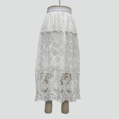 Elegant White Lace Sheer Long Skirt Mesh Embroidery High Waist Mid-length Skirt