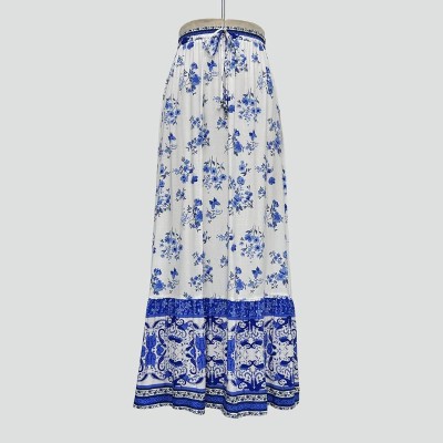 Vintage Blue and White Porcelain Print Drawstring High Waist Maxi Skirt