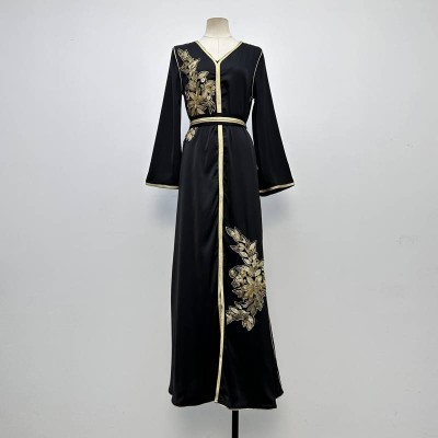 Black Gold Trim Embroidered V-neck Long Dress Luxury Banquet Party Maxi Dress