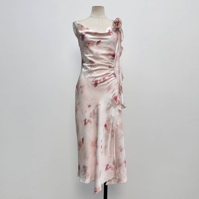 Pink Blur Print Satin Sling Midi Dress Elegant Slim Off-Shoulder Formal Dress