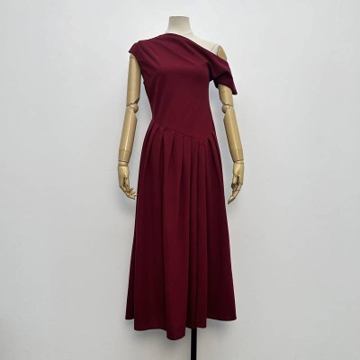Elegant Burgundy One-shoulder Off-the-shoulder Pleated Midi Dress Party Gown
