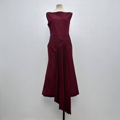 Wine Red Sleeveless Pleated Mid-length Evening Dress Elegant Banquet Dress