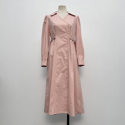 Pink V-neck Waist-tie Shirt-style Long Dress