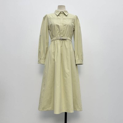 Vintage Court Style Printed Shirt Collar Waist Cinched Long Dress