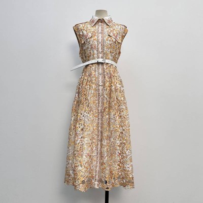 French Collar Sleeveless Waist Cinched Floral Midi Shirt Dress