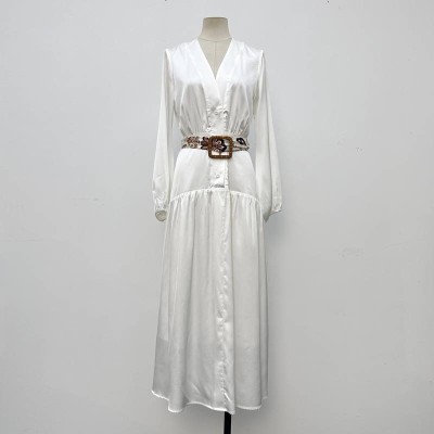 Elegant Satin V-neck Waist Midi Dress Long Sleeve Commute Dress