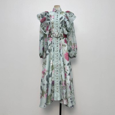 Vintage Court Style Printed Stand Collar Shirt Long Dress Waist Tie Long Sleeve Dress