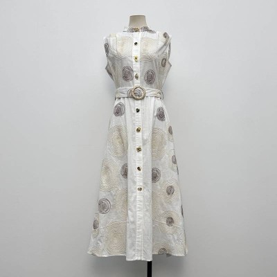White Sleeveless Embroidered Shirt Collar Waist-trimmed Midi Dress
