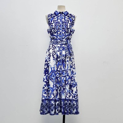Blue & White Porcelain Print Sleeveless Lapel Waist Cinched Midi Shirt Dress