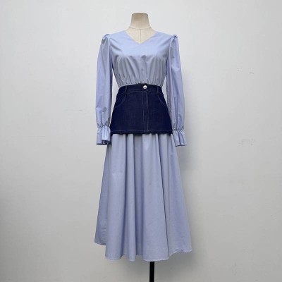 V-neck Waist-cinching Denim Patchwork Fake Two-Piece Shirt-style Midi Dress Elegant Slim Long-sleeve Dress