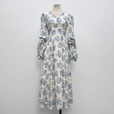 French haze blue floral puff sleeve mid-length dress gentle style waist cinching slim temperament dress