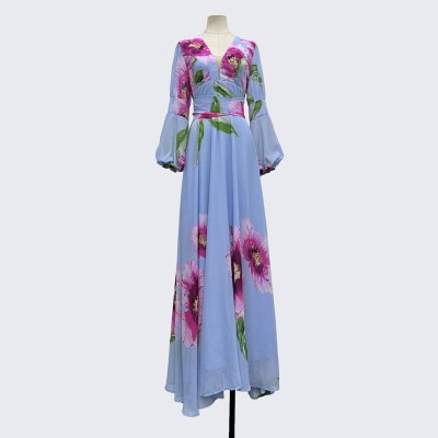 Blue Big Floral Print V-neck Long Sleeve Chiffon Maxi Dress Elegant Waist-cinched Dress