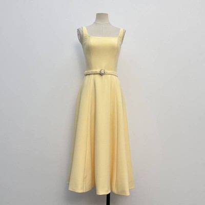 Elegant Square Neck Yellow Sling Midi Dress Waist Slimming Temperament Dress