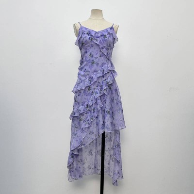 French Romantic Purple Floral Chiffon Slip Dress Irregular Ruffled Midi Dress