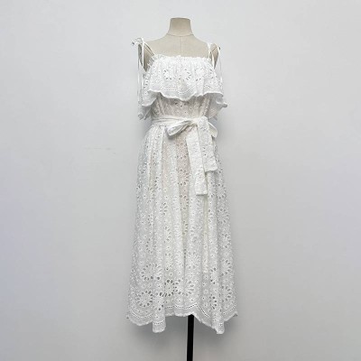 White Hollow Lace Sling Off-the-Shoulder Waist-Tie Midi Dress