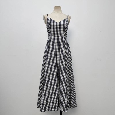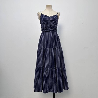 Vintage Blue & White Gingham V-neck Spaghetti Strap Maxi Dress Slim Fit Elegant Dress