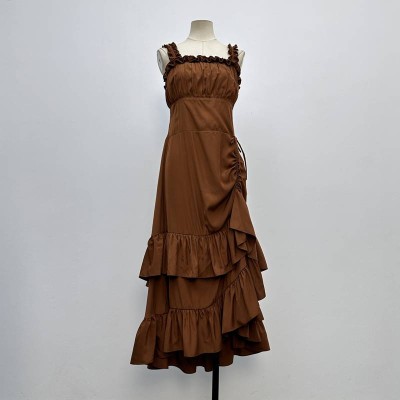 Vintage Brown Ruffled Strap Maxi Dress Waist Drawstring Irregular Hem Dress