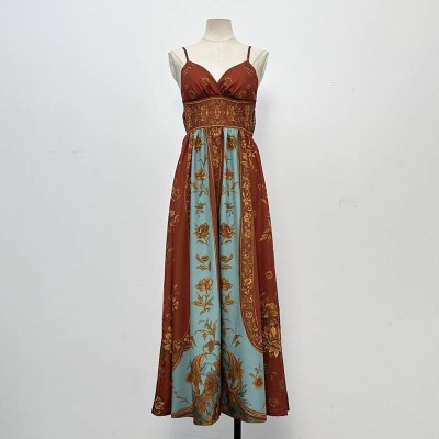 Vintage Print Spaghetti Strap Maxi Dress Waist-cinched Vacation Dress