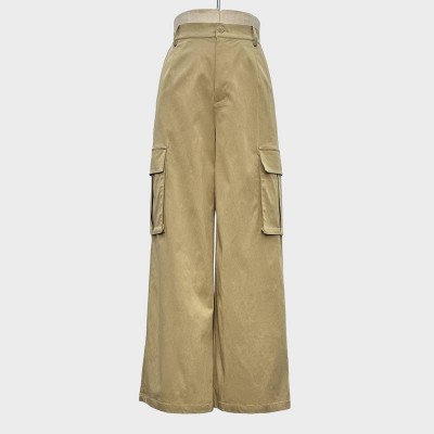 Khaki Cargo Wide-Leg Casual Pants with Large Pockets