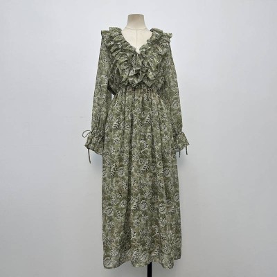 Vintage Floral V-neck Ruffle Waist Long Sleeve Chiffon Maxi Dress
