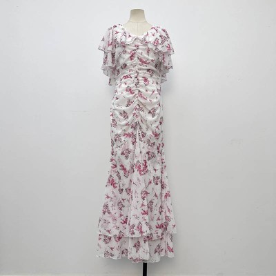 French Floral Pleated Chiffon Maxi Dress Ruffle Slim Mermaid Dress
