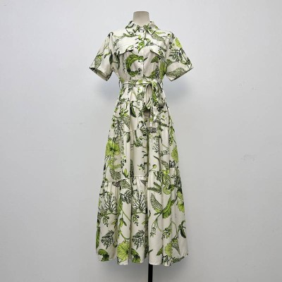 Fresh Plant Print Lapel Short Sleeve Tie Waist Shirt Style Maxi Dress