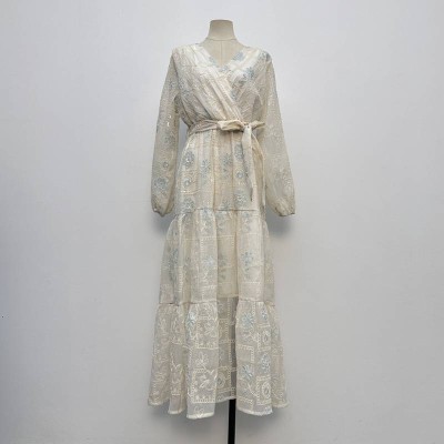 V-neck Embroidered Waist-tie Maxi Dress Elegant Gentle Style Slimming Long Dress