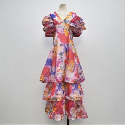 Romantic Printed Puff Sleeve V-neck Ruffled Maxi Dress Elegant Chiffon Dress