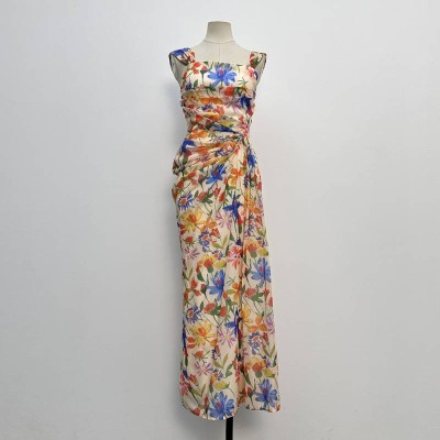 Vintage Print Satin Straps Maxi Dress Pleated Slim Fit Dress