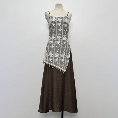 Vintage Lace Patchwork Suspender Long Dress Fake Two-piece Temperament Dress